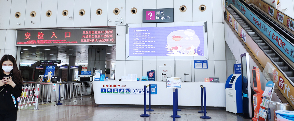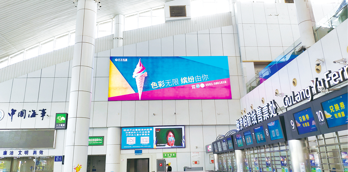 媒體位置設立于廣場/外圍,售票大廳,候船大廳,乘船通道,南北出入口等區(qū)域